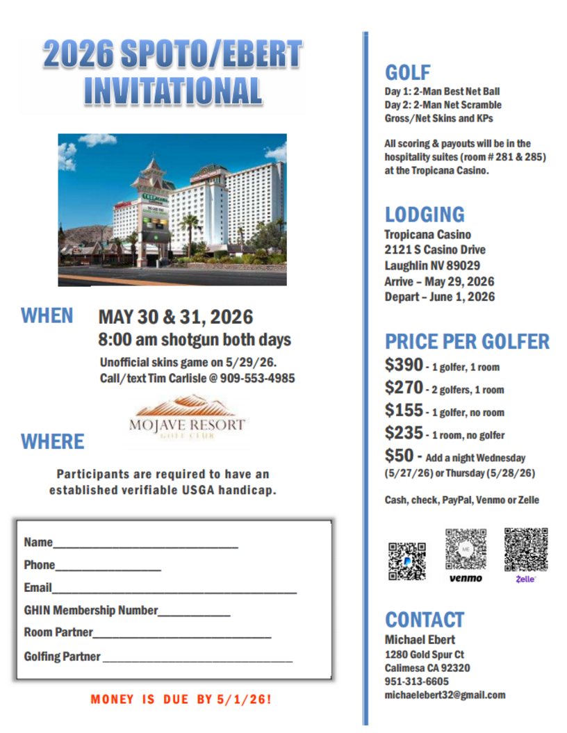 Tom Spoto started this tournament in 2001 by gathering a group of friends for a golf trip to Mesquite, NV. There has been an annual trip every since. Destinations have included Laughlin, NV, Mesquite, NV, and Pahrump, NV. This year the tournament will be in Laughlin, NV. This is not a Calimesa Men's Golf Club tournament and is open to members of the Men's Club, non-members, men, and women. Tournament details are listed below. If you have any questions, please contact Michael Ebert at 951-313-6605 or michaelebert32@gmail.com.